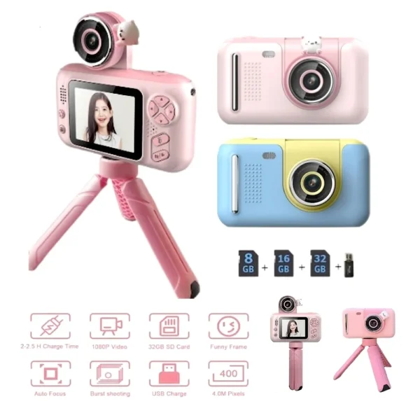 3. Accessories: This kid-friendly camera is equipped with a 2.4-inch screen and a tripod/selfie stick, which improves usability and makes it easy for kids to take photos or videos. Desktop tripod fixed / selfie stick shooting unlocks a new mode of taking pictures. Also includes a portable lanyard pendant for easy portability and mobility.